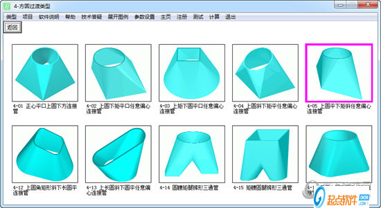 本类型为矩形管、四棱锥管与圆管、圆锥管连接的构件,包括矩形管相交圆管、四棱锥管相交圆管构件,矩形管相交正圆锥管、斜圆锥管构件,四棱锥管相交正圆锥管构件,圆管直交四棱锥管构件等6种形式。构件品种齐全,各个构件内的各部尺寸、倾斜角度、偏心量可在一定范围内任意输入。