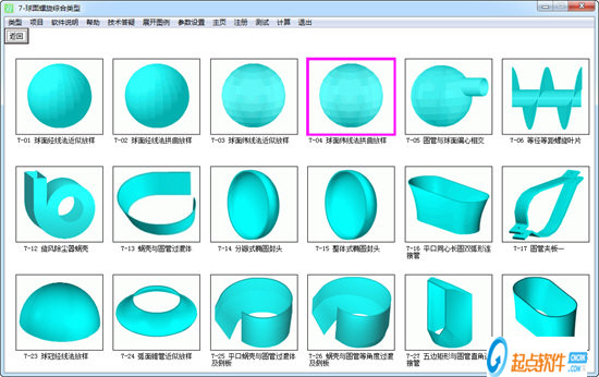 本类型为不可展曲面的近似展开和连接的构件,包括圆球罐的经线法、纬线法近似展开放样,圆球罐热胀冷缩制作法的经线法、纬线法展开放样,圆管与球面相交构件,还有等径等距螺旋叶片、等径变距螺旋叶片、变距等径螺旋叶片、变距变距螺旋叶片、内外同锥螺旋叶片等构件的展开放样等9种形式。构件品种齐全,各个构件内的各部尺寸、螺距、直径、偏心量可在一定范围内任意输入。