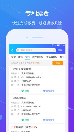 汇桔云app是一个用于知识产权查询管理的综合服务平台,汇桔云软件中拥有查询、预警、企业托管等特色功能,可以帮助企业随时随地查询产权状态,轻松管理专利续费、知产托管等相关信息。