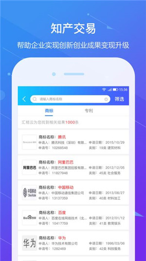 汇桔云是一款为知商企业提供知识产权云服务的应用工具,包括查询、管理、预警、续费、企业托管等功能,已服务超过20万+企业级用户,集中在新一代信息技术、人工智能、大数据、区块链等领域。