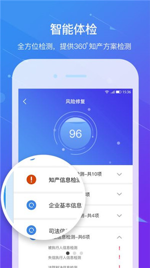 1、随时随地查询企业知识产权状态。2、多维度、深度了解企业背景与风险。