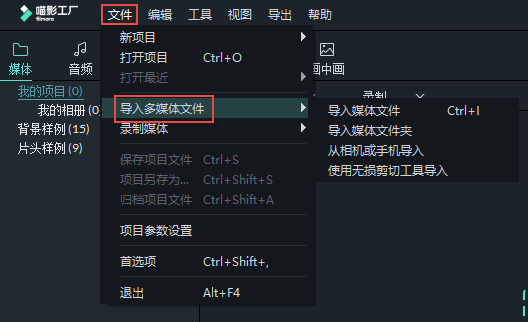 方法1:单击“文件>导入多媒体文件”,选择“导入媒体文件”、“导入媒体文件夹”或“从相机或手机导入”。