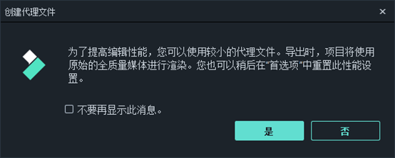 导入媒体文件时,程序可能会询问您是否要创建代理文件以加快编辑过程。代理文件是由于分辨率较低而小于原始文件的第二个媒体文件。这使编辑变得更容易,然后当您导出最终视频时,完整质量的原始媒体将被交换回。我们建议选择“是”以创建代理文件,以获得更快的视频编辑体验。