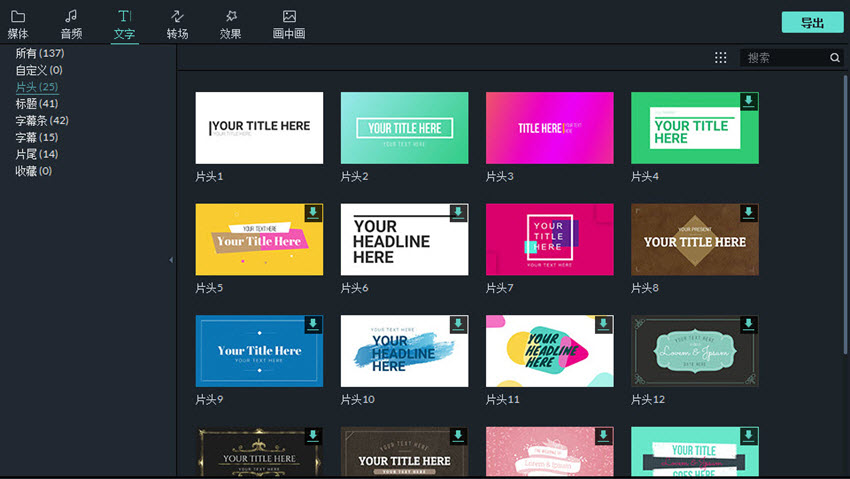 如果想要添加片头,可以在“文字”菜单中选择左侧“片头”列表,右键单击喜欢的片头效果并选择“应用”。