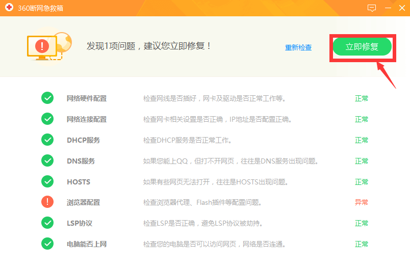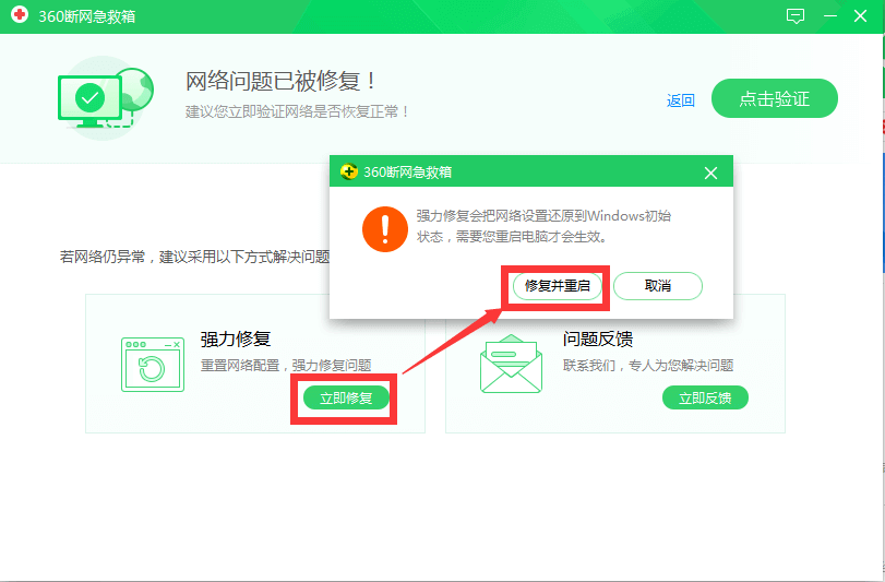 4. 修复完成后,点击“强力修复”下的“立即修复”,根据提示点击“修复并重启"。