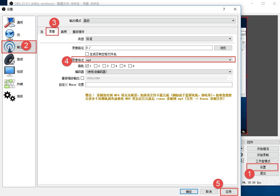 如果导入的是文件是通过OBS录制的.flv文件,请根据以下截图修改输出格式为.MP4,然后再导入到神剪手进行编辑。