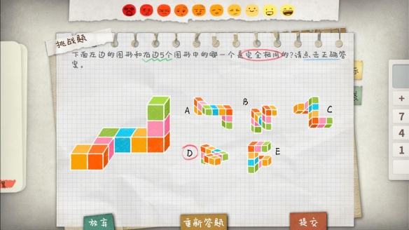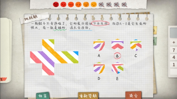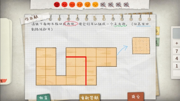 恰到好处的实体化美术《作业疯了》采用比较朴实但不乏细节的美术框架,部分 UI 呈现出一种综合了黑板报以及手工剪纸的实体质感,配色整体偏淡、偏素,对比度不高,就算长时间盯着那些题目也不会觉得疲劳。而最主要的答题部分当然就把 UI 做得像铺在牛皮纸信封上的试卷一样,下方是「放弃」,「重新答题」和「提交」三个基本操作。