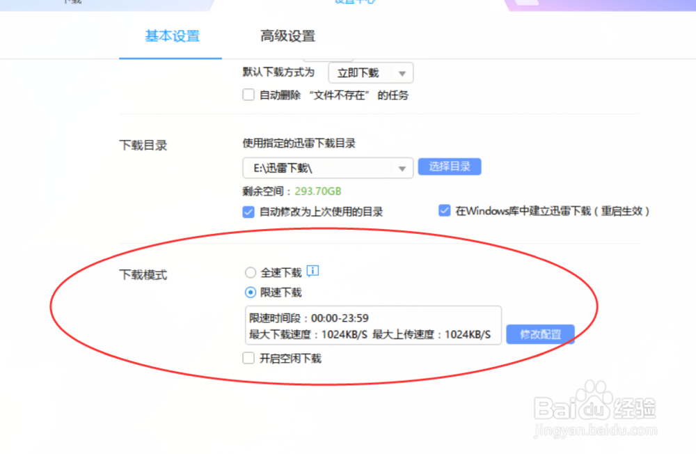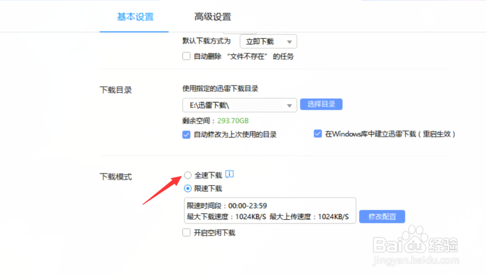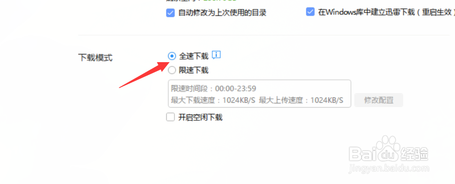 在页面底部,我们就可以看到下载模式选项了。我们将限速下载改为全速下载就可以了,如图示