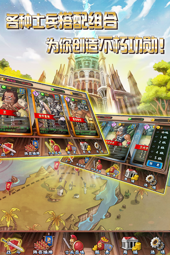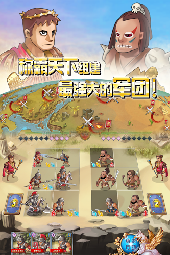 古罗马战争破解版是一款以古罗马历史作为故事背景的策略战争类游戏,这款游戏采用非常卡通的画风,我们的玩家可以去收集不同的卡牌,然后将这些卡牌组合成一支强大的军队。这样你不仅能够使用自己的军队来抵抗敌人的入侵,而且还可以带着他们去开疆扩土,建立属于自己的王国。