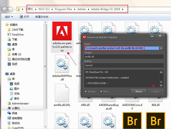 3、将数据包中解压出来的adobe.snr.patch.v2.0-painter.exe复制到上一步打开的目录下并运行,选中“Try to patch another product with the amtlib file (64-Bit)”然后点击右下角的patch即可