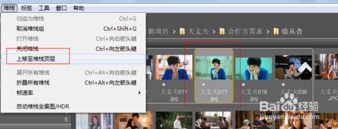 4、当叠在堆栈最上面的图片不是最能代表改组的图片时,还可以重新选择置顶图,只需点击数字展开堆栈,选中置顶图,然后选择堆栈>上移至堆栈顶层,即可。