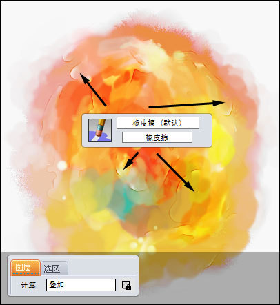 (1)新建文档。主要工具为“快速油画颜料”,使用橙、红、蓝、柠黄等颜色涂画,“快速油画颜料”带有轻微的混色属性,可以画出轻度的混色效果。之后使用“涂抹”对画面四周以及中间个别部分进行涂抹,使其过渡柔和。适当应用“扩散”工具,制造一种毛刺状的渗开效果。