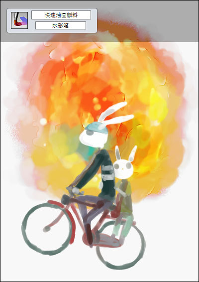 (5)新建图层。使用“快速油画颜料”绘制“骑自行车的兔子和坐在车后的小兔子”。此时不需要刻画细节,只需确定各部分大概色块和位置。