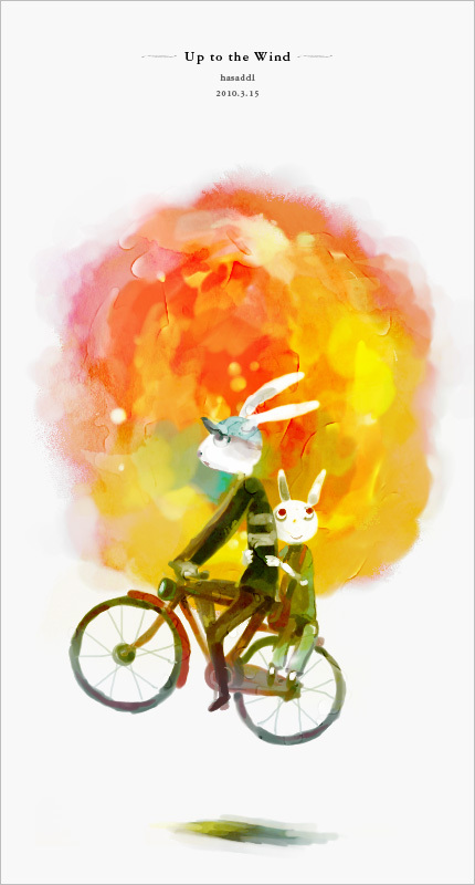 (6)使用“细丙烯树胶水彩笔”(名字很玄,其实就是带有非常轻微水彩效果的一种画笔)绘制细节,包括眼睛,车轮的辐条,人物的手和脚等。最后导入一张水彩纸的纹理叠加在所有图层之上并对“对比度”、“饱和度”等等做调整。(如果不习惯在openCanvas中做后期处理,openCanvas支持将文件保存为PSD格式,之后就可以在PS中继续润色了。)