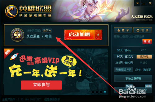 用户点击下载安装了迅游网游加速器之后,系统默认的1区艾欧尼亚。玩家如果想要选择自己的大区,需要点击下图红色箭头所指处。