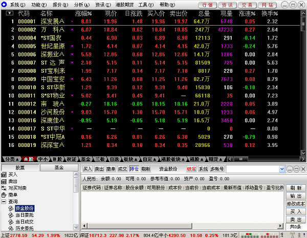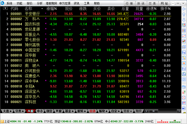 答:按F3或F4后,在右下角选择"值",里面有统计信息,若想看整个沪深市场的情况,找到沪深300指数,在它画面右下角的"值"中有整个沪深市场的情况