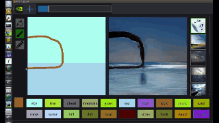 软件界面上方支持调节画笔的粗细,左方可以选择风景材质类型,比如大山、河流、森林、沙漠海洋等,下方支持更换背景。如果你不会玩,可以看看这个视频,GaoGAN的开发者们手把手教你怎么玩!