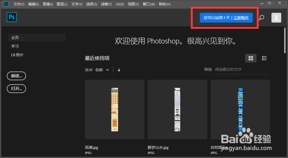 我们再次打开PSCC2019软件,这个时候我们发现左上角的试用7天没有了,那么我们就成功的安装上软件啦,接下来就可以正常使用了。如果一直在打转的小伙伴,我们点击左上角的PS图标,直接进入工作区就可以了。