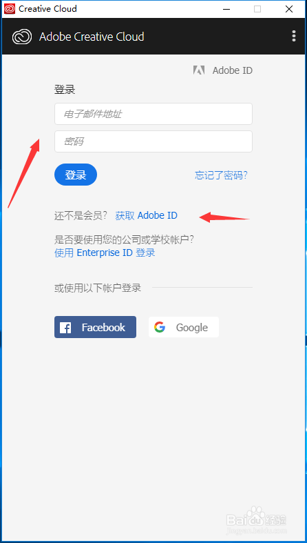 安装完成之后,软件会自动打开,如果你的电脑是第一次安装Adobe软件,那么他会提示你登录你的Adobe账号,如果没有账号可以点击获取AdobeID进行注册一个。有账号登录之后就可以进入PS界面。