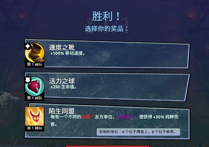 战利品选择阶段:遭遇野怪的回合独有阶段,根据与野怪的胜负关系,在给出的多个选项中选择一件装备或者buff作为你的战利品奖励,永久存在/生效。(哦补充一点,圣剑是唯一一个可能失去的装备,与DOTA2的规则类似,如果落败则圣剑归属于获胜方。)获取的装备可由拥有的一个棋子进行装备,每个棋子最多只能装备一件装备。