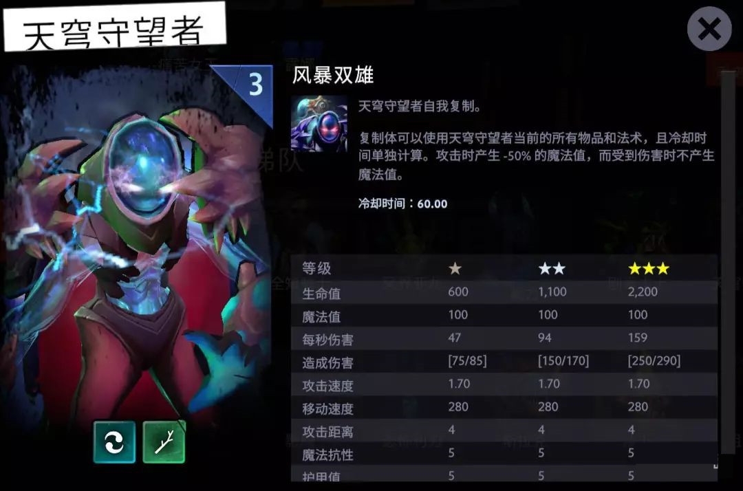 复制体可以使用天穹守望者当前所有的物品与法术,且冷却时间单独计算。攻击时产生-50%的魔法值,而受到伤害时不产生魔法值。复制体在有蓝的情况下可以再进行自我复制,利用电狗越复制越多的方法达到血入对方20+血量的目标。