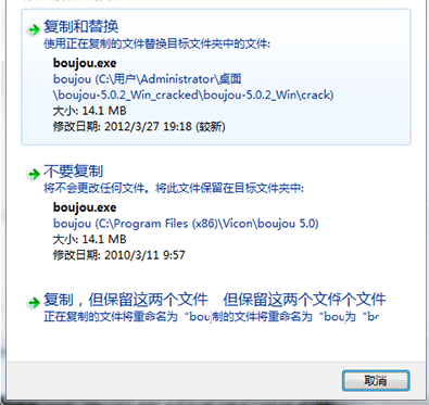 6、先不要运行软件,打开crack文件夹,将破解文件“boujou.exe”复制到安装目录下覆盖源文件,默认安装目录为C:\Program Files (x86)\\boujou 5.0;