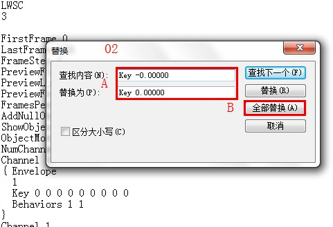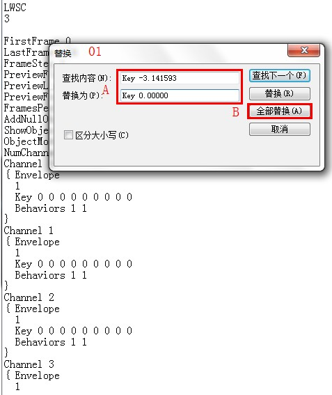 例如在“查找内容”中输入【Key -3.141593】、“替换为”输入【Key 0.00000】,点击“全部替换”即可把前者全部替换为后者!