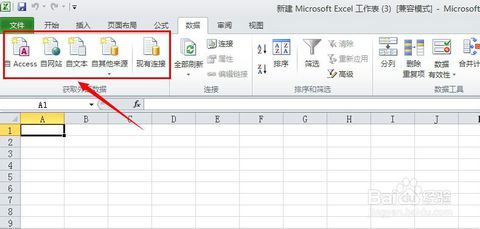 2、在菜单中,可以找到“数据”项,点击它我们就看到了关于“数据”的横向列表项。如下图所示。在下图中,我们就可以看到关于外部数据的选项了,Access类数据最常见,所以放在的首位。