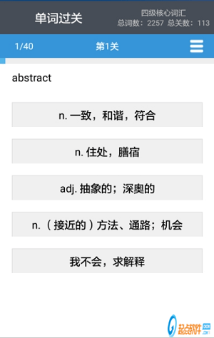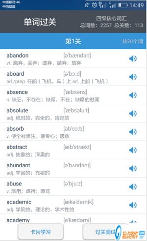 金星四级词汇软件是一款门针对于英语四级考取的词汇学习软件,这里拥有海量四级英语词汇供你学习背诵,你可以使用这款软件迅速的提高自己的 英语知识水平,不管是日常使用的时态语句还是考试中经常出现的完形填空,这里全都有!相信你在彻底掌握这些单词后,可以轻松应对考场,考取英语四级证书!金星四级词,涵盖《大学四级考试大纲》规定的2257个核心词汇,每关20个单词,每个单词都配有中英文例句,看英文选中文,看中文选英文,两遍都对才能过关哦!没有华丽的动画,却能真真切切地助你过关!每天十分钟,争取过两关!