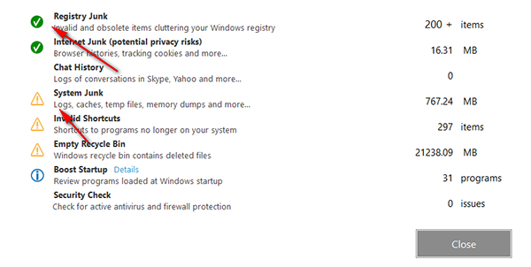 3、出现“感叹号”的项目都是有垃圾的,您应该在扫描完毕以后将其清理