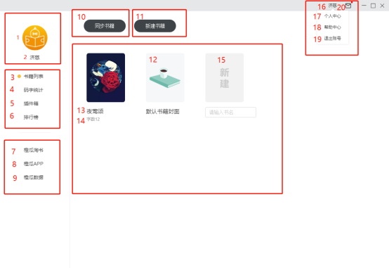 15. 数字15为快速创建书籍按钮,点击该按钮后,在输入框内填入书名,可快速创建书籍;