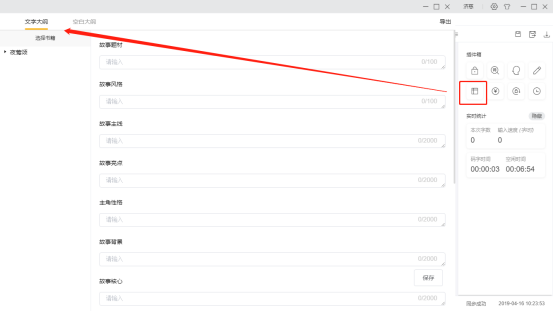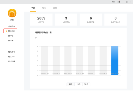 4. 数字4为码字统计按钮,点击切换到码字统计页面,此页面包含当前用户码字字数/码字时长/码字速度等数据;