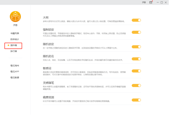 5. 数字5为插件箱按钮,点击切换到插件箱页面,插件箱是一系列码字工具的集合,目前包括写作大纲,强制锁定,随机锁定,随机起名,敏感词检索,灵感随笔,稿费预测等;