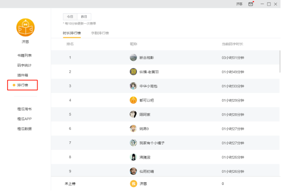 6. 数字6为排行榜按钮,点击切换到排行榜页面,排行榜页面包含橙瓜码字所有用户今日/昨日码字总字数排行前50名,码字总时长前50名;