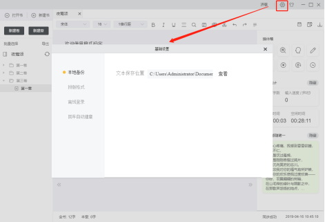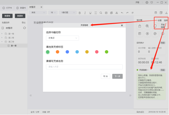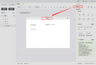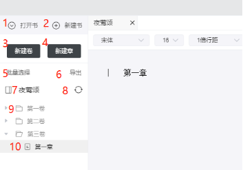 10. 数字10为目录章,左键单击该按钮,编辑区展示该章内容.右键单击,弹出章节操作框,包含创建新章,重命名,删除,打开本章文件夹,时光机等操作;