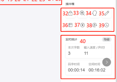 40. 数字40为实时统计区,包含本次码字字数统计,输入速度统计,码字时间统计,空闲时间统计;
