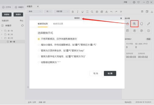 33. 数字33为敏感词检索,点击进入敏感词页面,可选择敏感词替换方式,如高亮显示,增加分隔线,并可自定义添加敏感词;