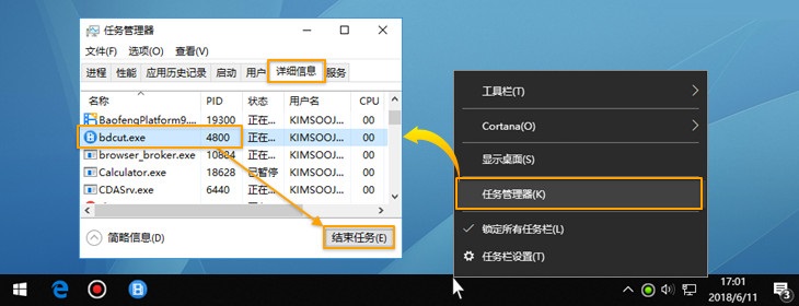 提示:如果弹出 “不能打开要输入的文件” 或 “程序正在运行中,请先关闭程序” 错误信息的话,请在【任务栏右击 - 任务管理器 - 详细信息 - 选择 “bdcut.exe” 结束任务】然后再次尝试安装。