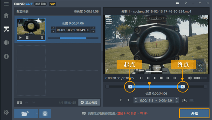 3. 通过移动如图所示的工具来选取你想要截取的片段,然后点击 “开始” 进入下一步。