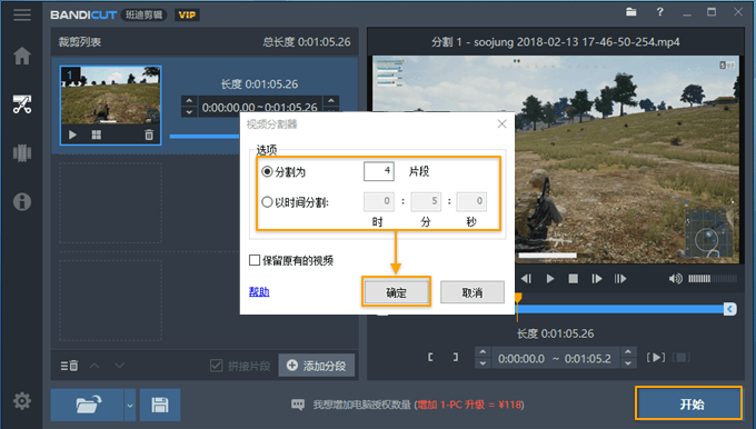 3. 把一个视频均等分割为多个相同时间的片段,或者选择分割的段数,然后点击 “确定” 。