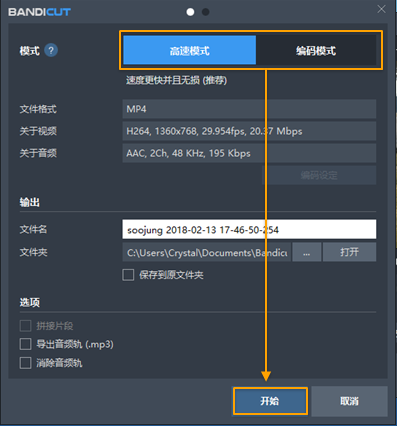 4. 如果没有什么特殊要求,选择高速模式行了,将你无损的剪辑会比较快,因为它的编码和原视频一致。点击 “开始” 进入下一步。