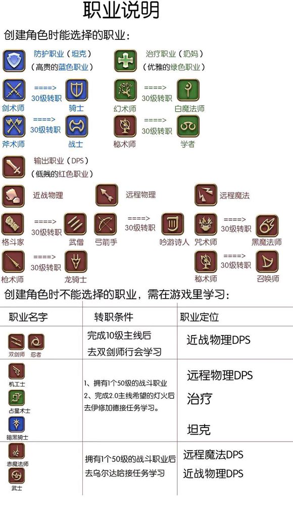 大部分的职业在初期就可以选择,少部分的职业需要达到等级后,领取任务即可转职。