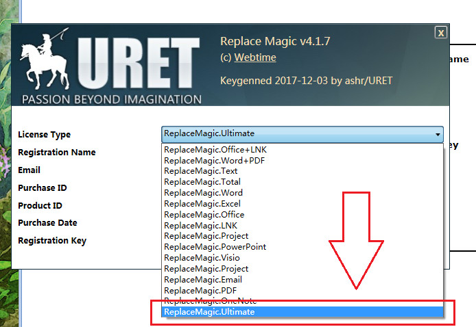 7、运行注册机,如图所示,软件选择ReplaceMagic.Ultimate,然后注册机自动生存注册码等,将信息对应复制到软件注册窗口。