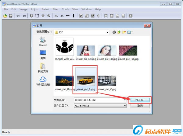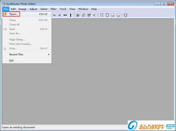 起点小编就给大家演示一下怎么使用SunlitGreen Photo Editor旋转图片和调整图片参数效果吧。首先我们试一下旋转图片。点击软件主界面中顶部菜单栏中的file文件,打开文件菜单。点击菜单中的Open打开,打开文件浏览窗口,选择图片。