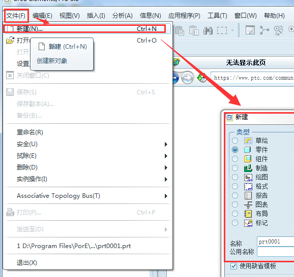 打开creo软件界面。点击左上角的【新建】按钮,弹出新建对话框。选择要建立的模型类型,如建立零件,随后选择子类型,如实体。然后,在【名称】后输入想要建立的文件名,例如001.