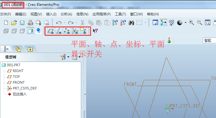 之后,点击【确定】,即可进入”001.prt“零件的设计界面,可以看到工作目录、常用工具栏、绘图区等功能区域。注意常用的【显示开关】,在绘图过程中,经常需要根据需要打开/关闭显示开关。