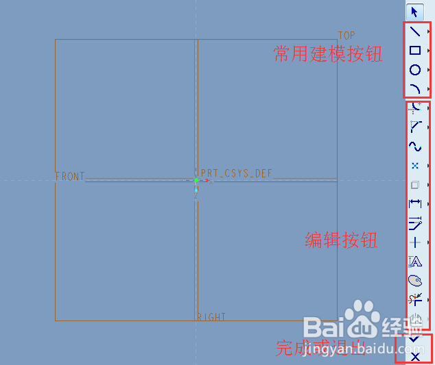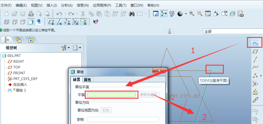 草绘是最基本的绘图操作,因为三维模型的建立是在二维的基础上建立起来的。首先,确认【平面显示】开关处于打开,可以看到初始的三个平面,FRONT、RIGHT和TOP。点击【草绘】按钮,弹出草绘的对话框,选择草绘的平面,如TOP。