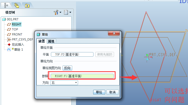然后选择【草绘方向】→【参照】和【方向】,通常选择默认即可,如果需要改变草绘的方向,可以根据需要选择。