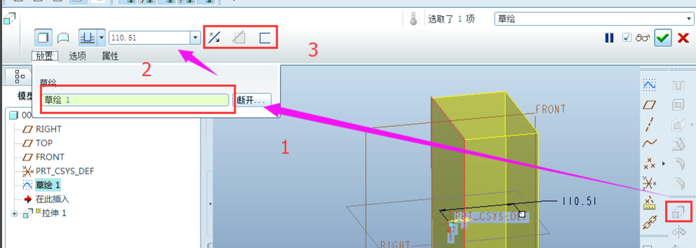 建立三维实体,是建立在草绘的基础上。这里以【拉伸】命令为例。选择【拉伸】,后点击【放置】,选择【草绘】,选择需要的草绘,选择拉伸为实体或曲面,然后修改拉伸的长度,以及后面的去除材料、拉伸方向等。