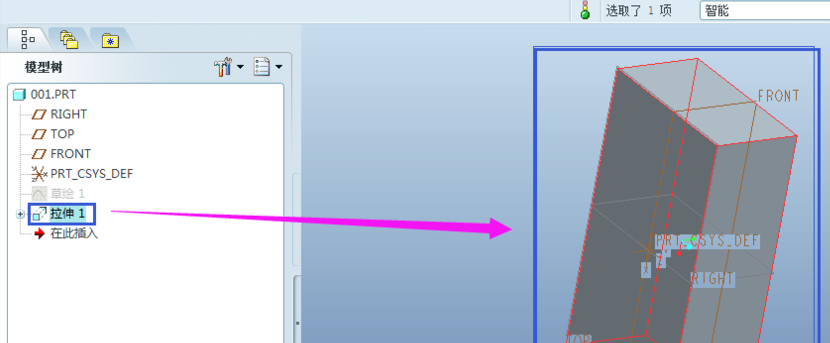 设置好参数后,点击鼠标中键,则完成了拉伸的操作。在左边的树状图里即可看到刚刚建立的实体【拉伸1】